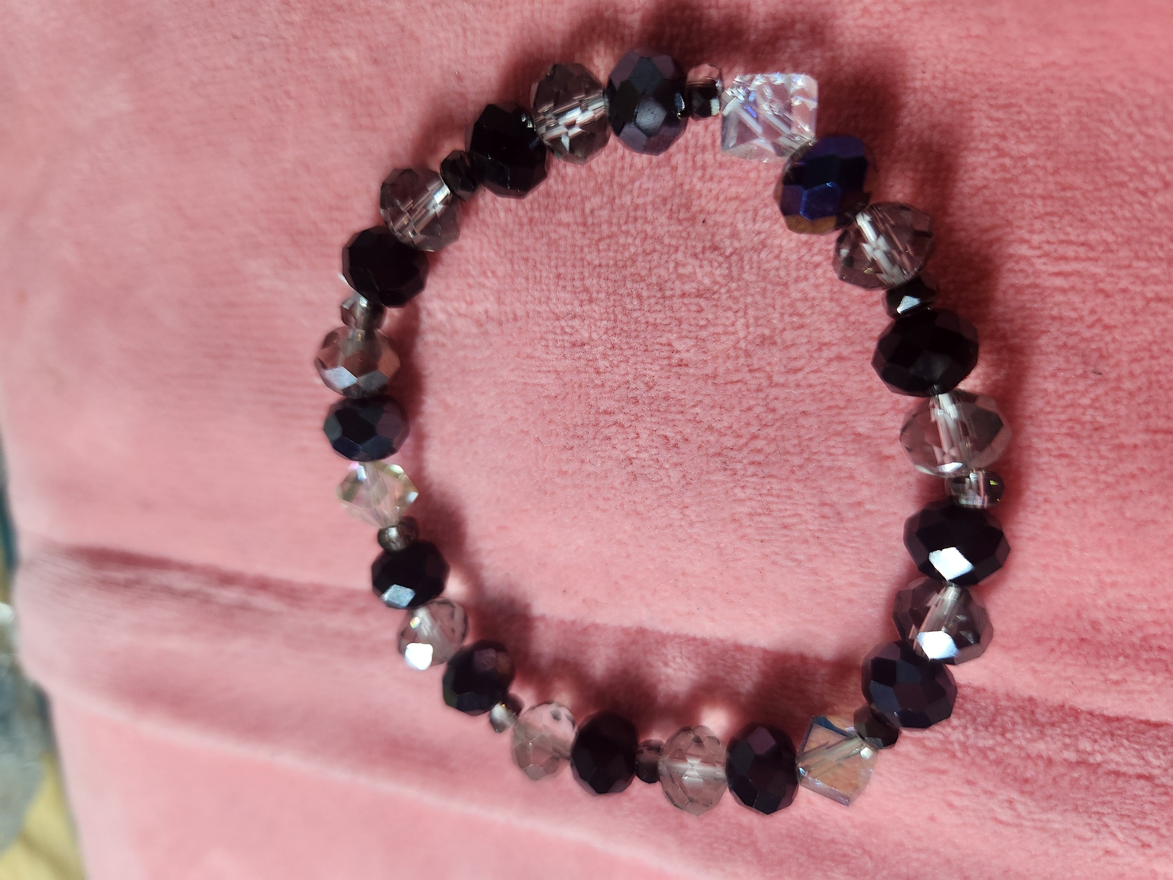이 팔찌는 **블랙 컬러 패싯 컷 비즈**와 **투명 크리스탈 비즈**가 교차 배치된 디자인이 특징입니다. 각 비즈는 빛을 받으면 자연스럽게 반사되어 고급스러운 분위기를 연출합니다.