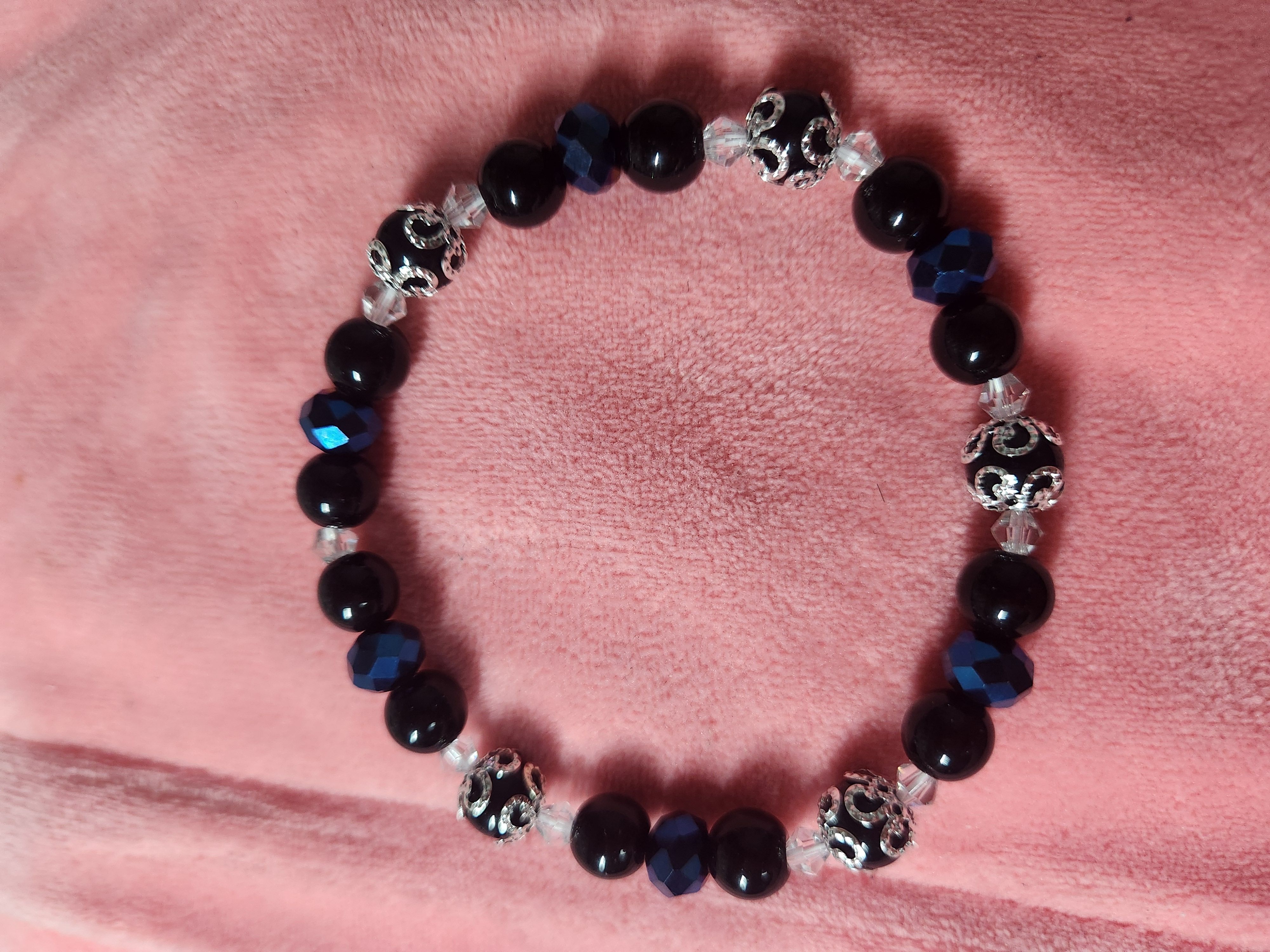 이 팔찌는 **유광 블랙 오닉스 비즈**를 중심으로 **네이비 컬러 패싯 컷 크리스탈 비즈**가 리듬감 있게 배치된 디자인이 특징입니다. 사이사이에 투명 크리스탈과 실버 장식 비즈가 더해져 단조로움을 줄이고 고급스러운 포인트를 완성합니다.
