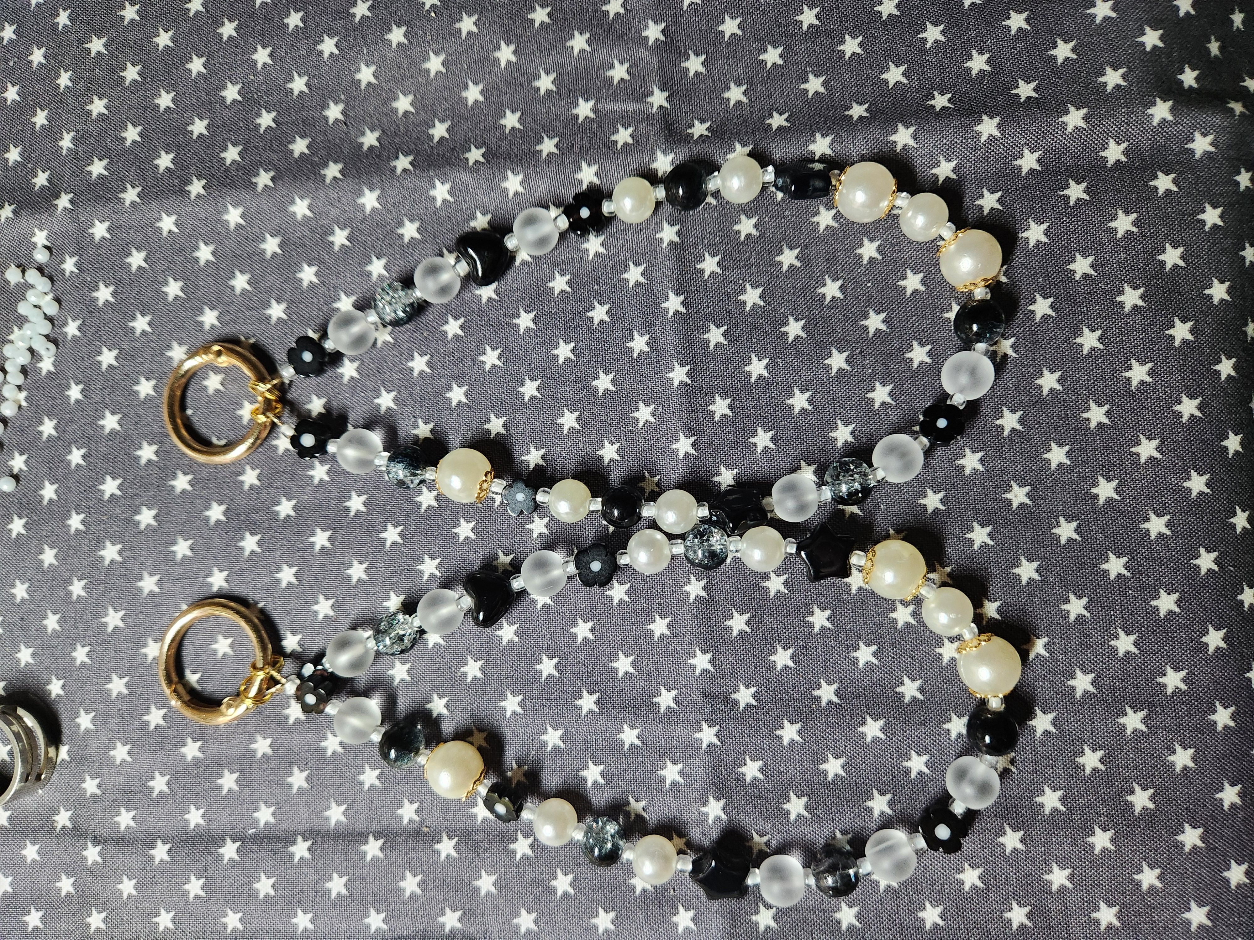 - 핵진주/모조진주 (8mm~10mm): 우아한 광택을 담당하는 메인 비즈입니다. 완전한 화이트보다는 약간의 크림빛이 도는 진주를 선택해 블랙 비즈와의 대비를 부드럽게 만들었습니다.