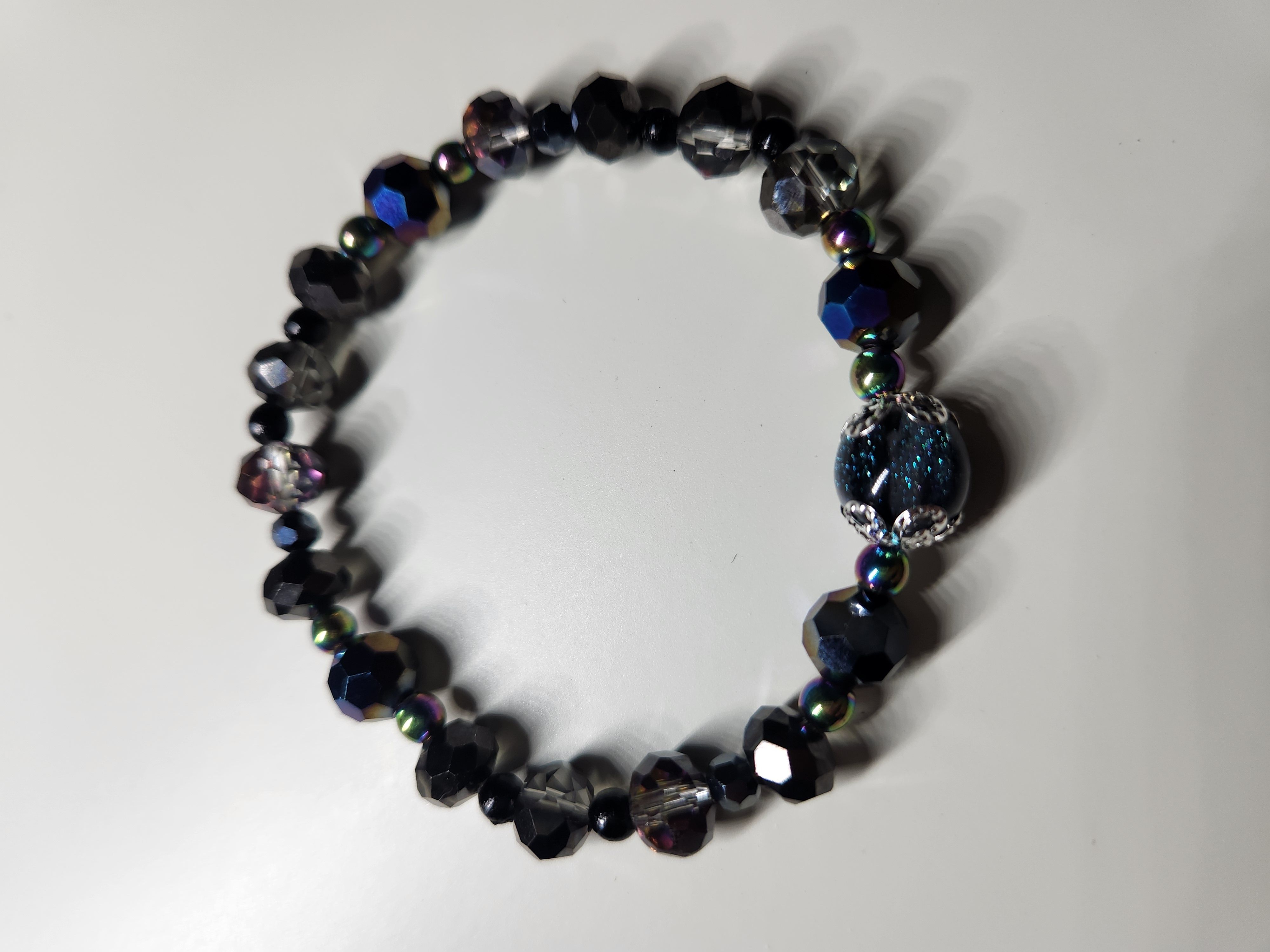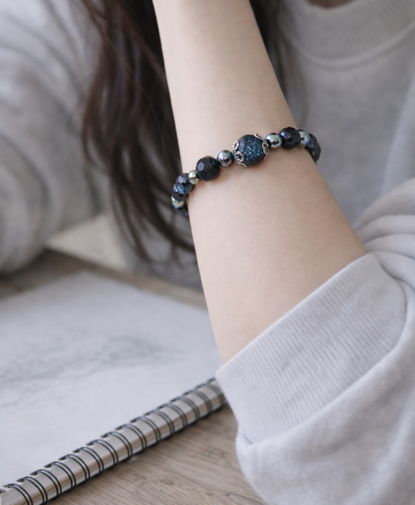 주변을 구성하는 커팅 글라스 비즈들은 ‘Aurora Borealis(AB)’ 공법이 적용되었습니다. 1950년대 크리스탈 제조 공정에서 시작된 이 코팅 기술은 비즈 표면에 얇은 금속막을 입혀 빛의 굴절에 따라 무지개 빛을 내는 것이 특징입니다. 본 제품에서는 블루, 퍼플, 골드 톤의 광택이 주변 조도에 따라 교차하며 나타나는데, 이는 정적인 블랙 팔찌에 역동적인 생명력을 불어넣는 역할을 합니다.