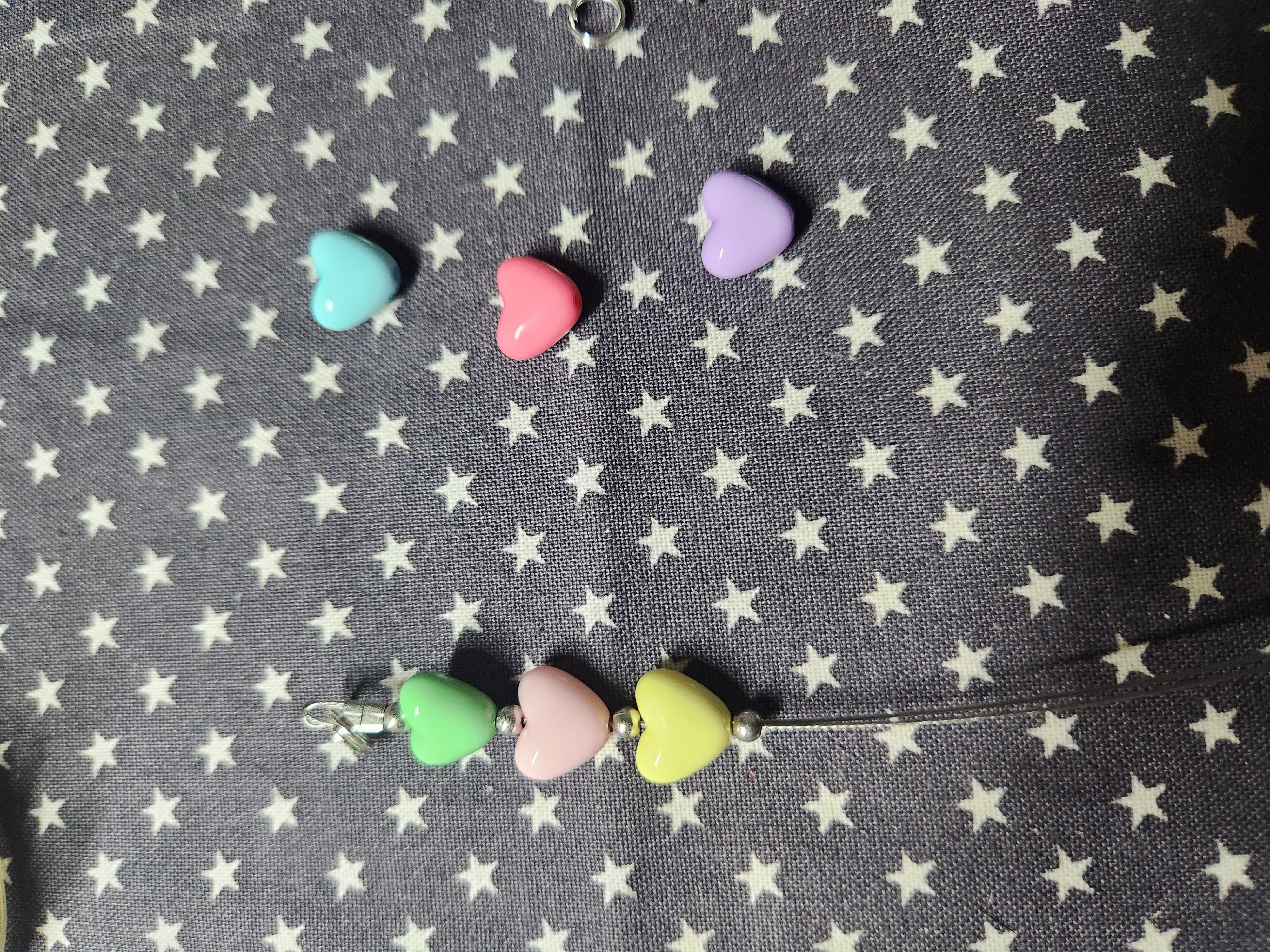 2. 상단 하트 구간 연결 연두색 하트 아래로 작은 실버 볼 비즈를 하나 끼워 간격을 준 뒤, 연분홍색 하트노란색 하트를 순서대로 끼웁니다. 하트 사이사이에는 실버 볼 비즈를 넣어 움직임이 자연스럽게 해줍니다.