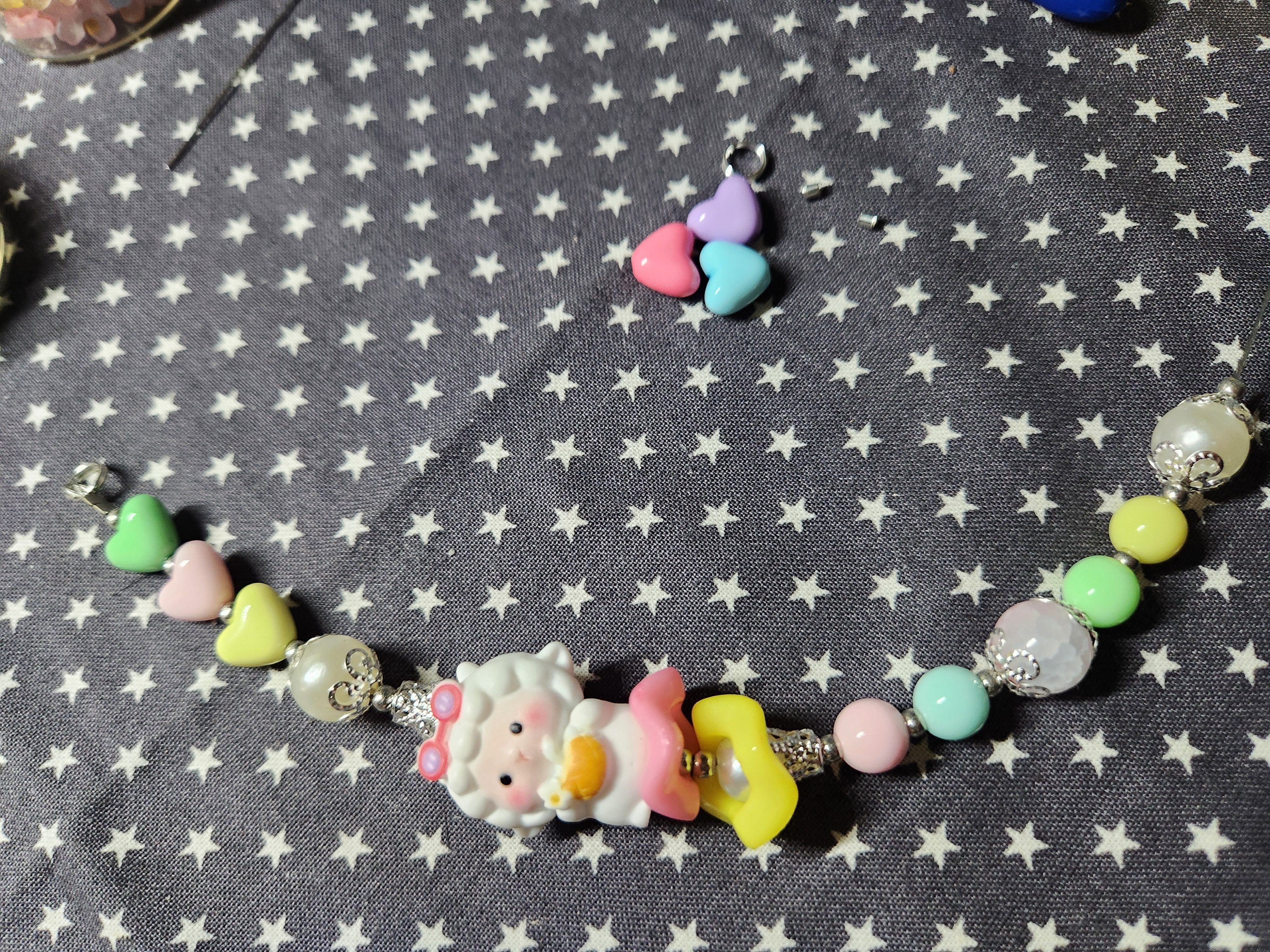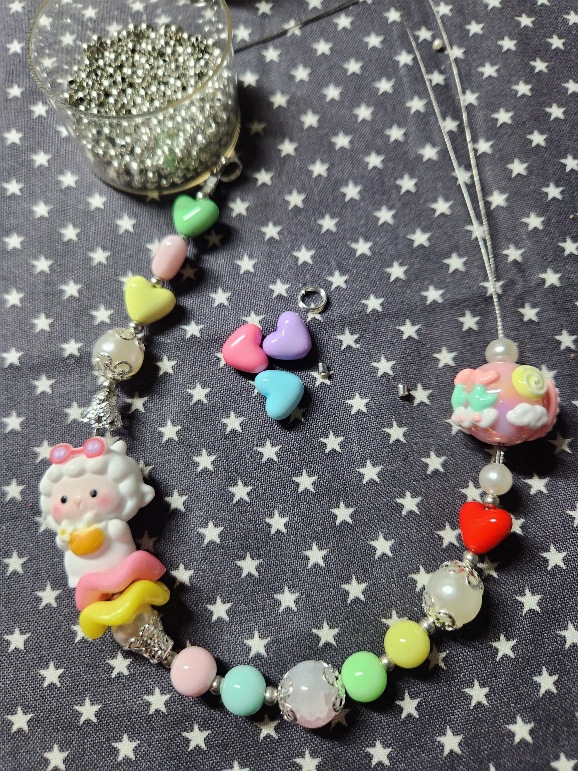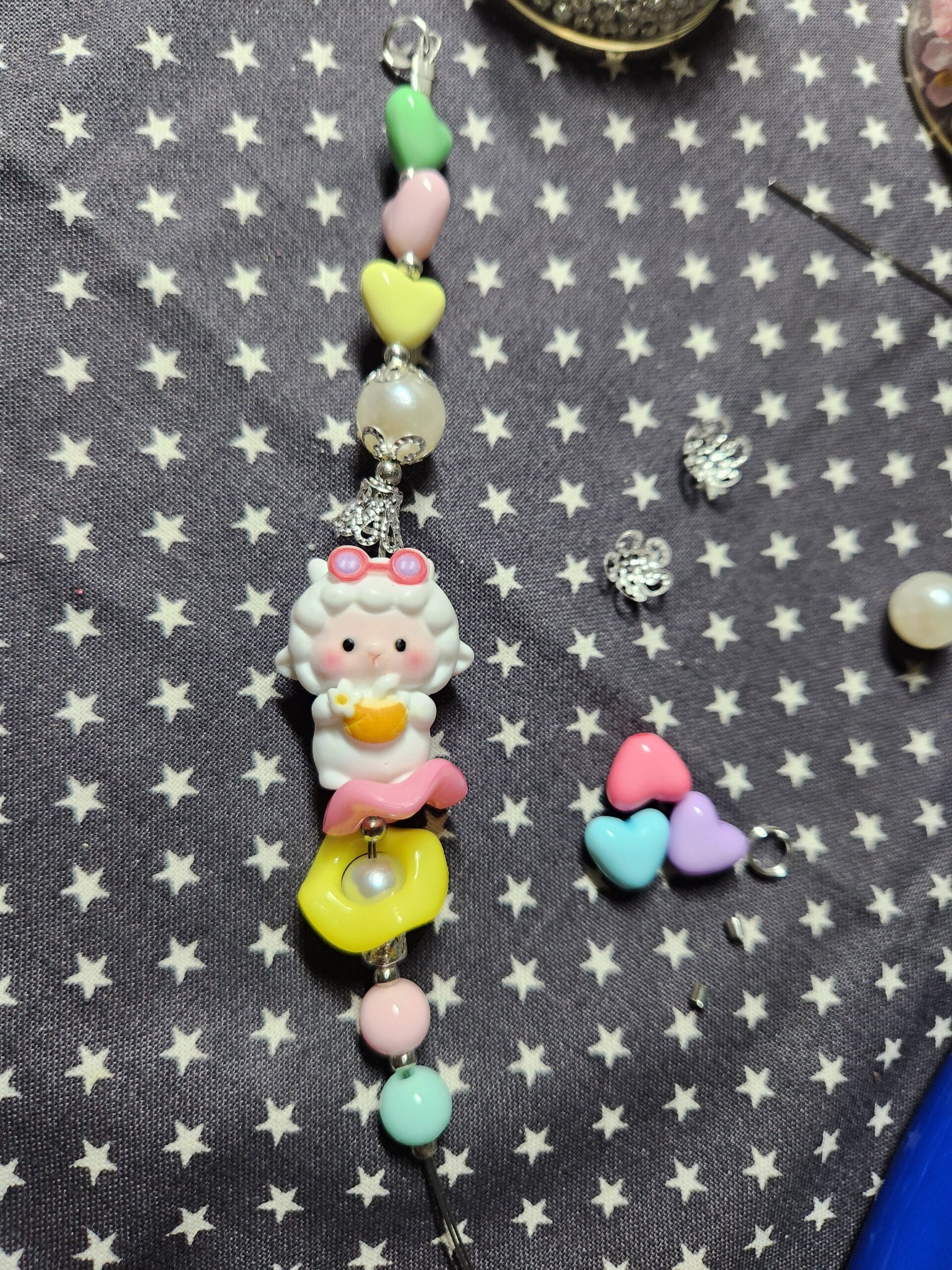 3. 캐릭터 및 상단 장식 배치 노란색 하트 다음에 실버 볼과 진주 비즈(은색 비즈 캡 포함)를 끼워 무게감을 줍니다. 그 아래로 메인 파츠인 양 캐릭터를 통과시킵니다. 양 캐릭터 아래에는 입체적인 **꽃 모양 파츠(분홍, 노랑)**를 연결하여 캐릭터를 받쳐주는 느낌을 줍니다.