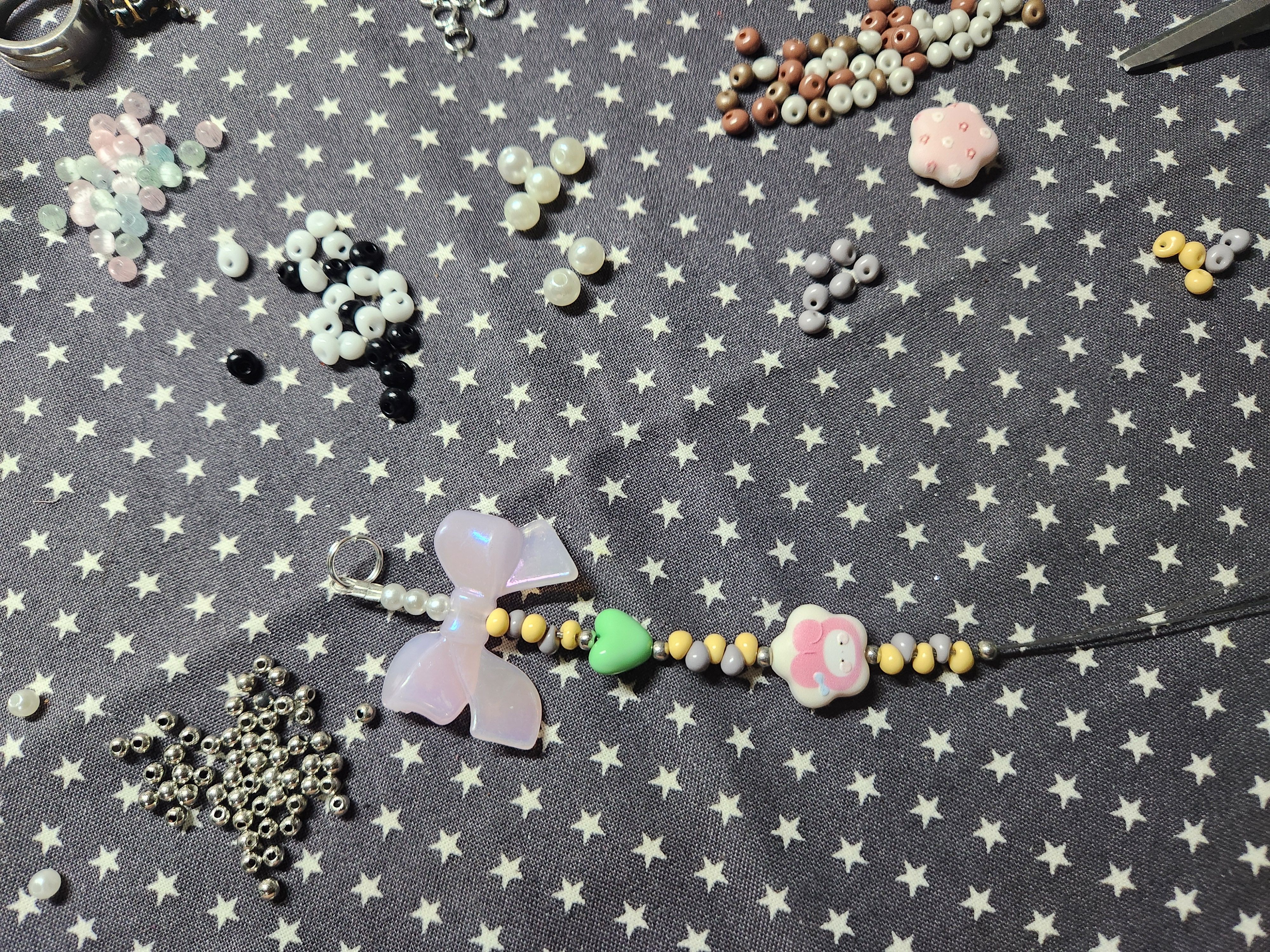 - 상단 리본 배치: 줄의 시작 부분에 작은 진주 비즈를 몇 개 꿰어 고급스러운 느낌을 준 뒤 이번 작품의 메인인 대형 핑크 리본 비즈를 중앙에 배치합니다.